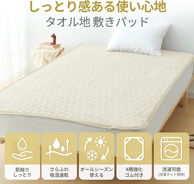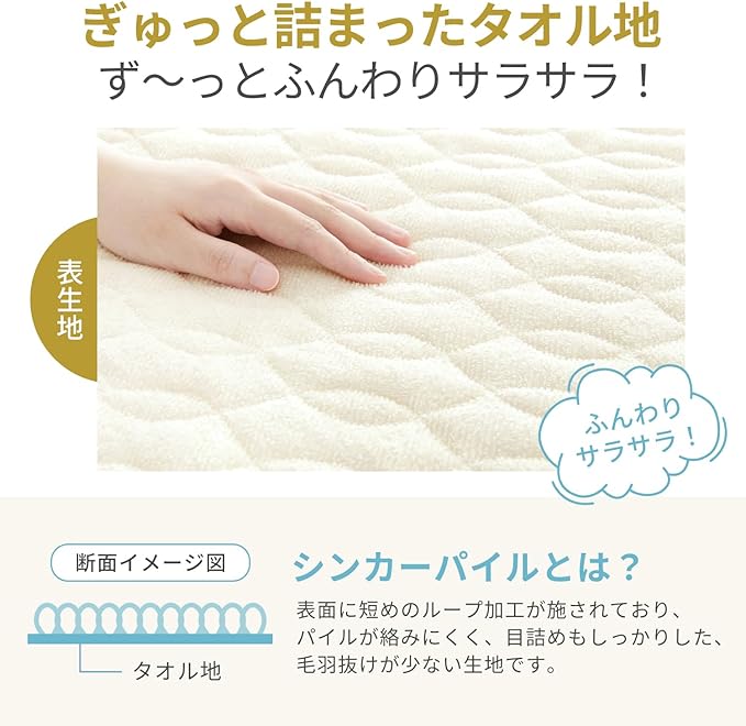 【ロングシーズン使えるシンカーパイル生地】敷きパッドの表面に短めのループ加工が施されたシンカーパイル生地は、表面積が広く、吸水性と通気性に優れています。タオルのようなふんわりサラサラとした肌触りで、汗をかいてもすぐに吸収・速乾。夏は汗をかいてもさらっと快適、冬は空気の層が保温効果を高めてふんわり暖かく、一年中快適にお使いいただける素材です。いつでも清潔に使える丸洗い対応で、お手入れも簡単です。※洗濯の際は必ずネットをご使用ください。