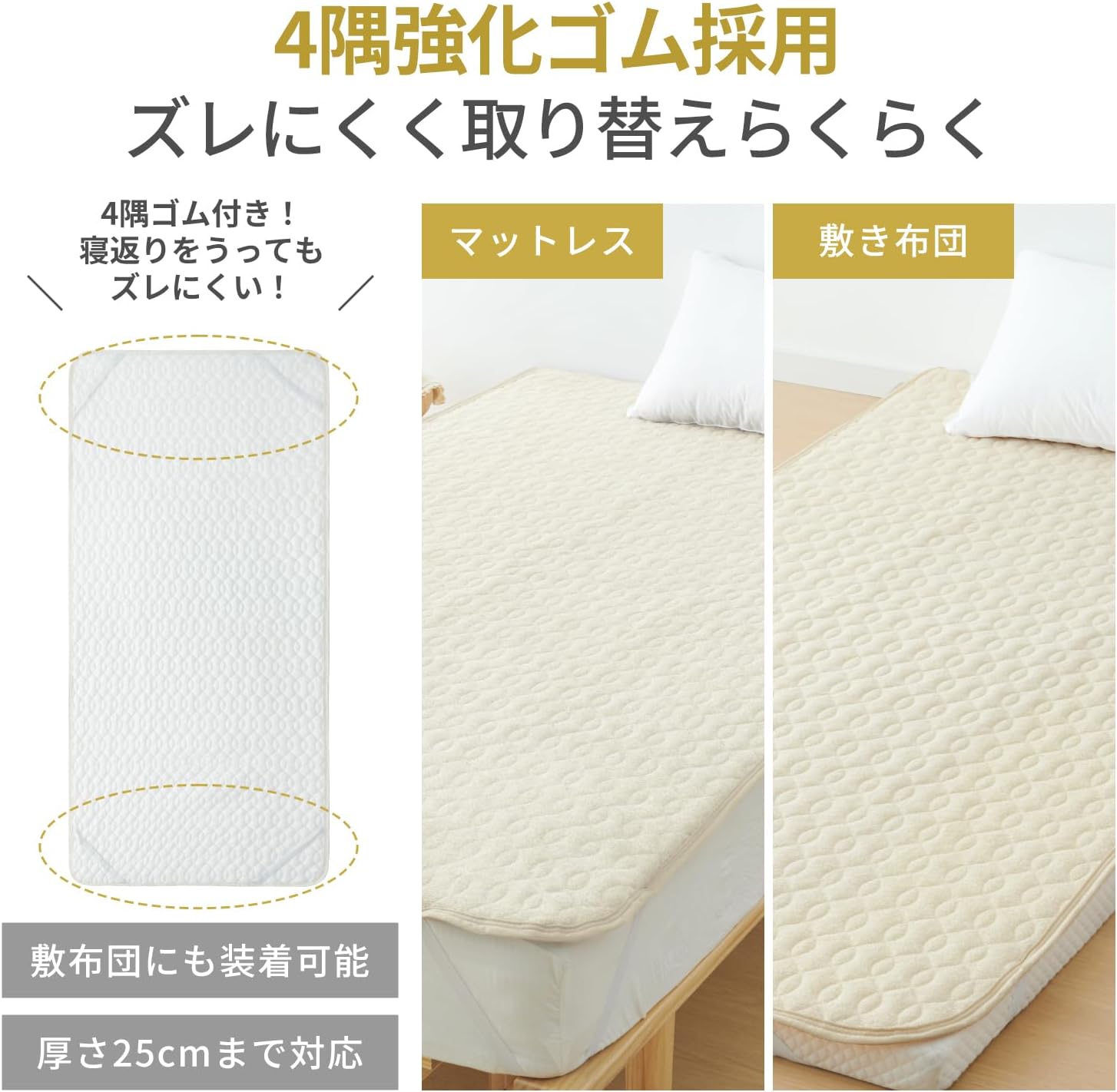 【4隅ゴムバンド&ずれにくいキルティング加工】ベッドパッドの4隅には強化ゴムバンド付き、厚さ25cmまでのベッド/マットレス/敷き布団にぴったりフィットします! しっかり固定して、着脱簡単。寝返りをうってもズレにくいです。さらに、見た目もすっきりしたキルト加工を施されており、最適な中わた量とキルトで全体が均等に仕上がります。