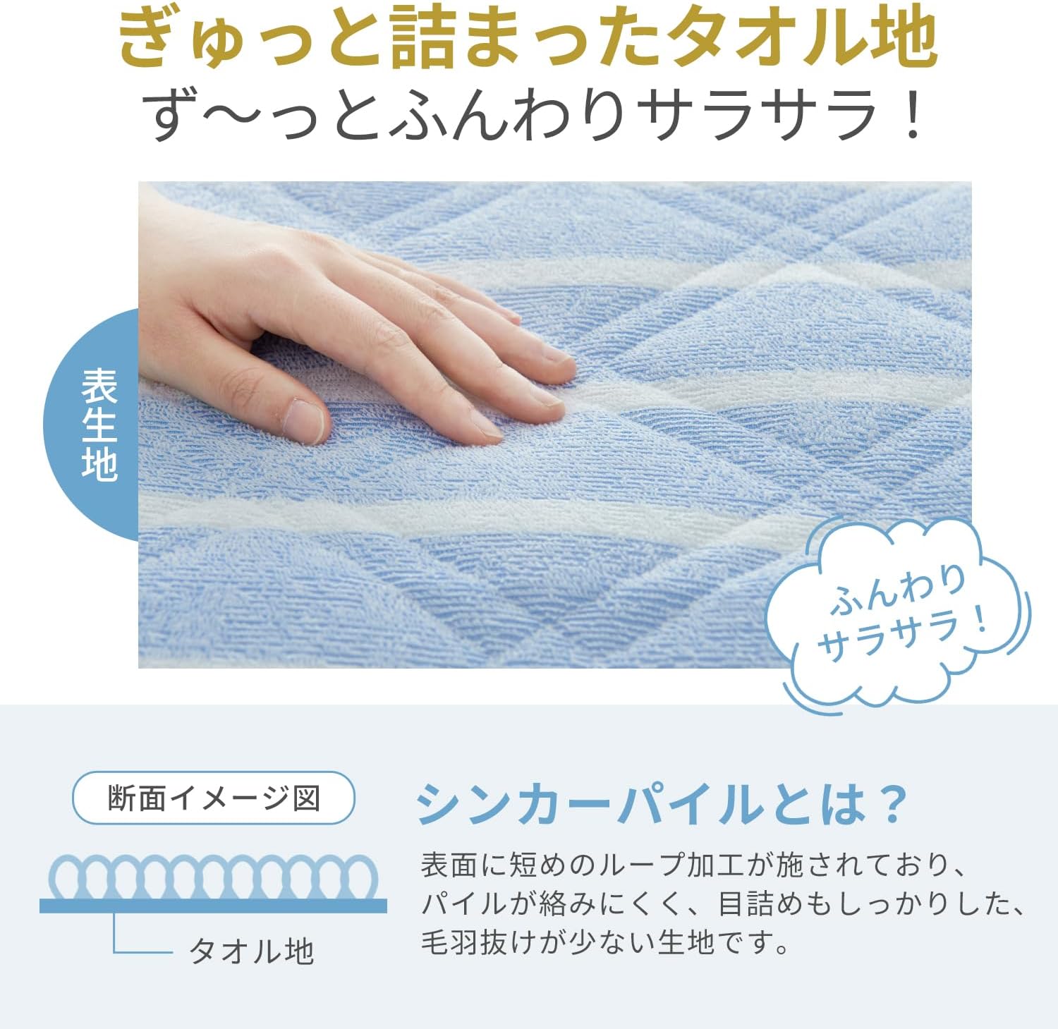【ロングシーズン使えるシンカーパイル生地】敷きパッドの表面に短めのループ加工が施されたシンカーパイル生地は、表面積が広く、吸水性と通気性に優れています。夏は汗をかいてもさらっと快適、冬は空気の層が保温効果を高めてふんわり暖かく、一年中快適にお使いいただける素材です。