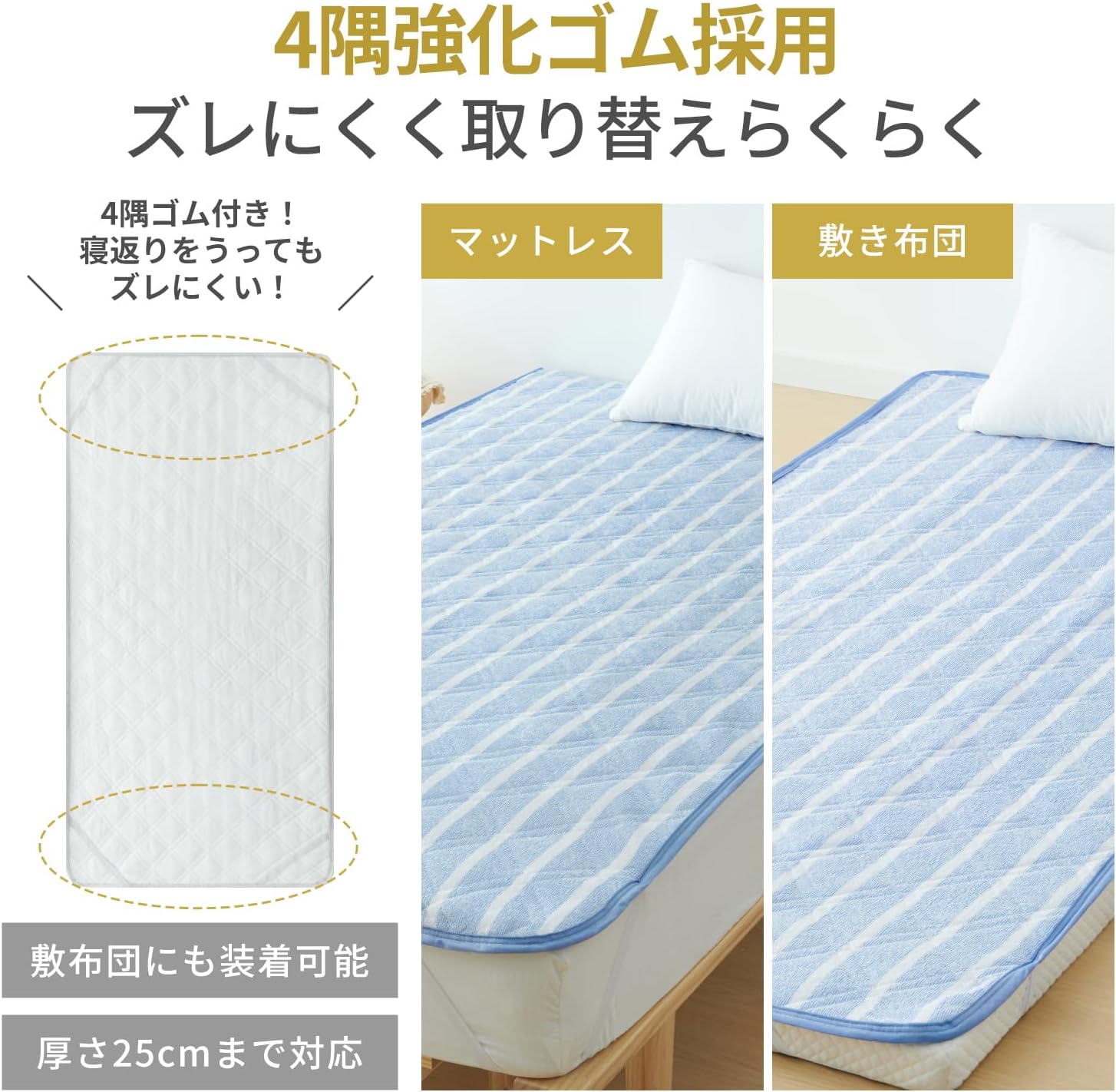 【4隅ゴムバンド&ずれにくいキルティング加工】ベッドパッドの4隅には強化ゴムバンド付き、厚さ25cmまでのベッド/マットレス/敷き布団にぴったりフィットします! しっかり固定して、着脱簡単。寝返りをうってもズレにくいです。さらに、見た目もすっきりしたキルト加工を施されており、最適な中わた量とキルトで全体が均等に仕上がります。
