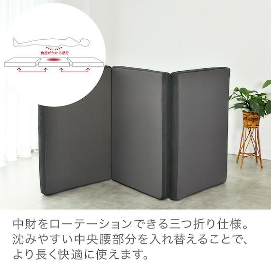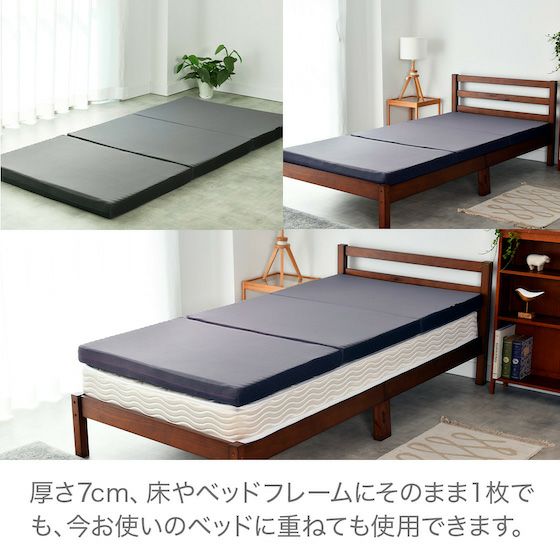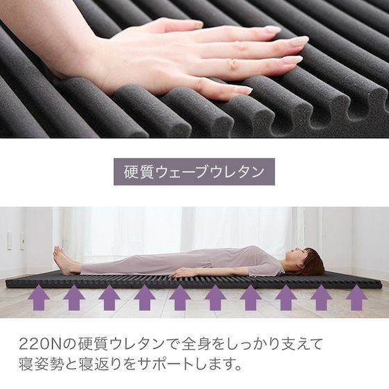 220ニュートンの硬質ウレタンを、ライズ独自のウェーブ形状にカットした高反発マットレスです。身体をしっかりと支える7cmの厚みで、寝心地の良さを保ちながら、自然な寝姿勢と寝返りをサポートして、腰痛対策にもおすすめです。お使いのベッドに重ねても、床やフローリングに直置きしても使えます。シングル約4.0kgと軽量、折りたためる3つ折り仕様で収納しやすいため来客用にも便利です。